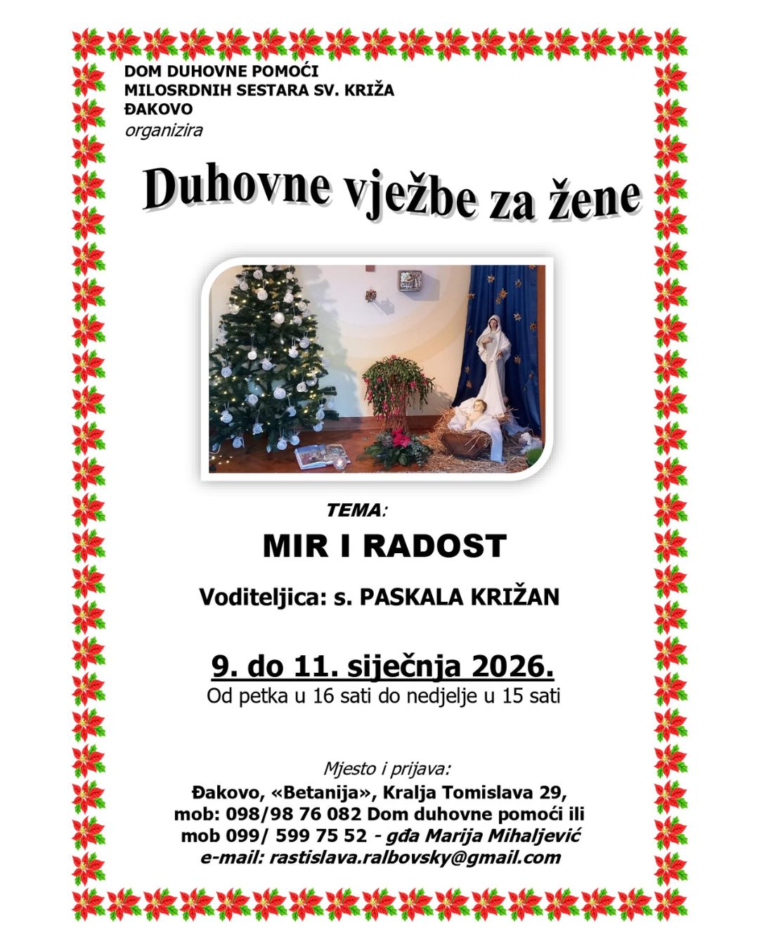 Možete dogovoriti termin: s. Gabrijela Tea Damjanović mob. 099 401 53 99