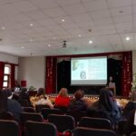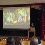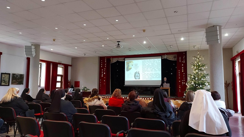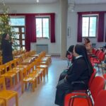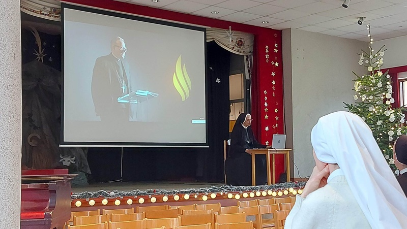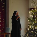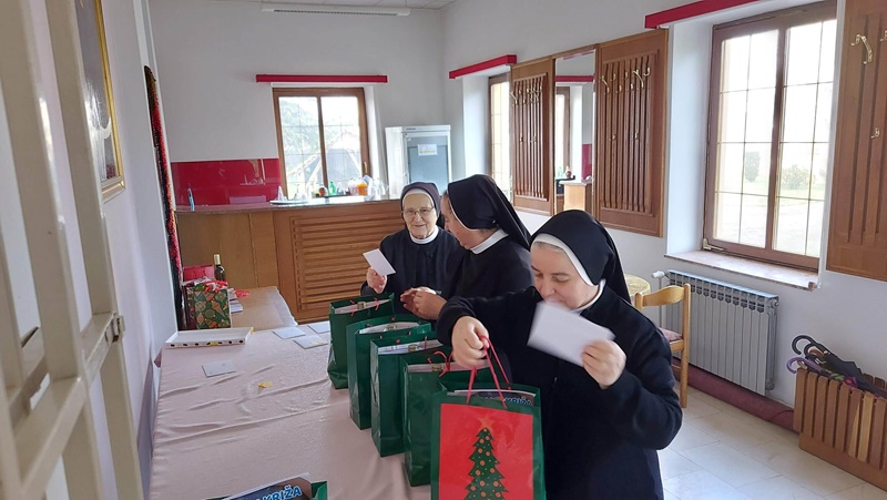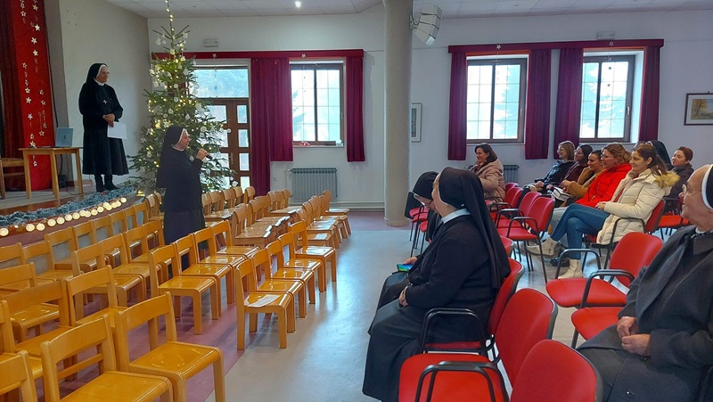 U srijedu, 20. prosinca 2023. godine, u Dvorani Florentini održan je susret čestitanja Božića djelatnicima samostana. Postulantica Ana Umiljanović i aspirantica Lucija Ofenbeher u uvodu su nastupile pjesmom Maranatha. Nagovor je održala s. Meri Gotovac na temu „Božić – Svetkovina Isusova rođenja“. Ona je u prvom dijelu izložila je temu Franjevačkoga jubileja te slavlja 800. obljetnice prvih jaslica u Grecciu. Napomenula je da se i u samostanskoj crkvi u Đakovu može također dobiti potpuni oprost u danima do Svijećnice, te ih upoznala s uvjetima. U drugom dijelu predavanja djelatnici su pogledali video nagovor američkoga biskupa Roberta Barrona „Bog je postao dijete“.