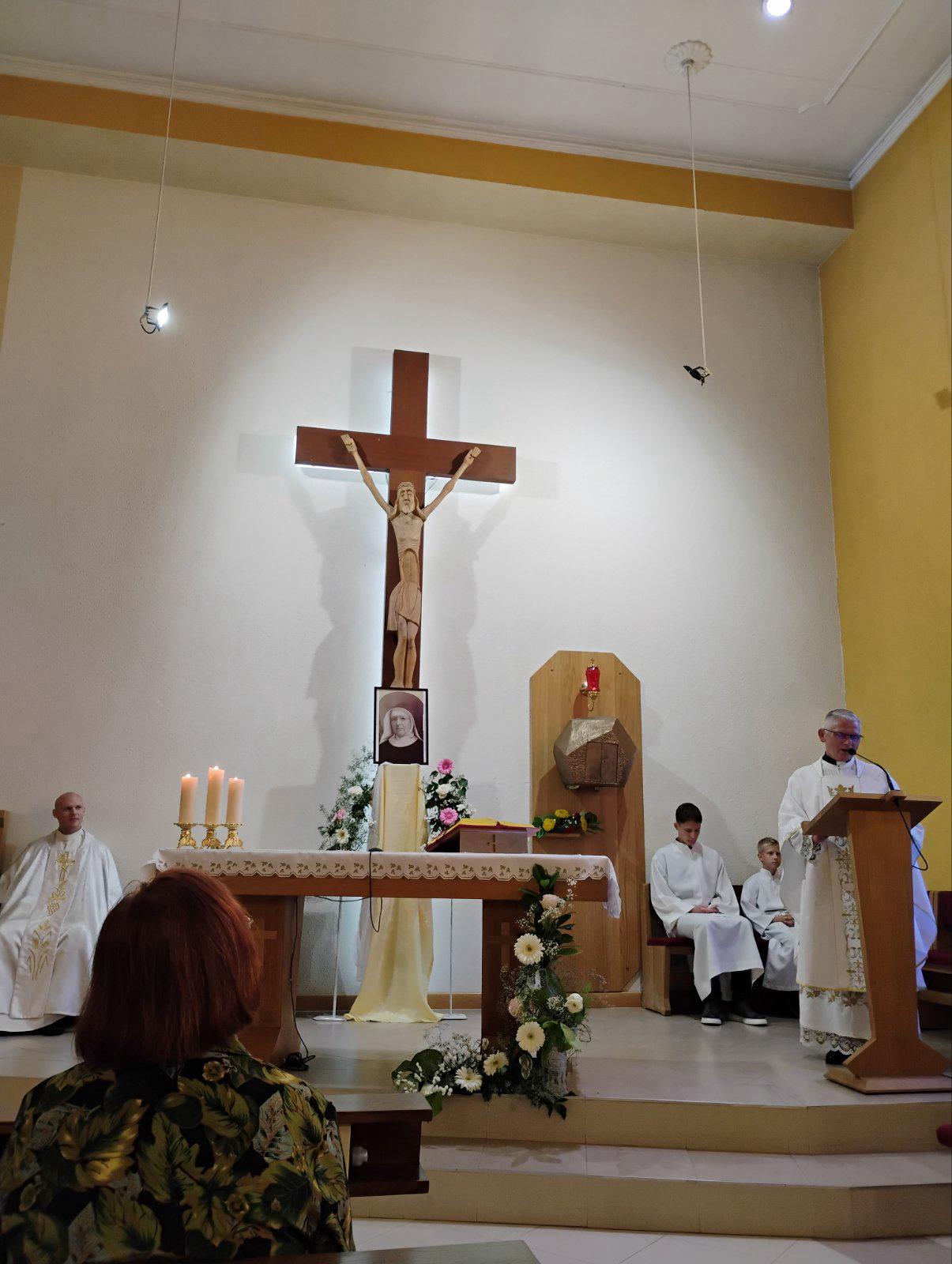 U homiliji voditelj misnoga slavlja spomenuo je problem beznađa, uzrokovan ranjenom nadom, slomljenom u susretu sa stvarnošću. „Ta napetost uzrokuje patnju, ali i sazrijevanje. To se dogodilo i u životu blažene majke M. Terezije. I u vrijeme njezina života, u vrijeme rađanja Družbe, mnogi ljudi živjeli su u beznađu. Blažena majka M. Terezija, vođena autentičnom ljubavlju za Boga i bližnjega, usmjeravala je ljude prema duhovnom i moralnom ozdravljenju. To ona čini i danas preko svojih duhovnih kćeri, koje su pune pouzdanja, s pogledom usidrenim u Kristu i otvorene potrebama vremena.“ Propovjednik se zatim prisjetio suradnje sa sestrama po župama gdje je prije bio. „Teški su poslovi premašivali snage sestara, ali su sestre zračile vedrinom i pouzdanjem. Iako umorne, s otkazima u bolnicama i u školama, osiromašene i obespravljene, nastavile su dobro činiti, činiti i ono što nisu morale, živeći s Isusom i za Isusa, služeći ljudima kojima su poslane. Pritom su na poseban način svjedočile svojim redovničkim odijelom, koje ukazuje na Boga i na njegovu brigu za ovaj svijet. Zagledane u otajstvo križa, slijedile su Raspetoga Krista.“