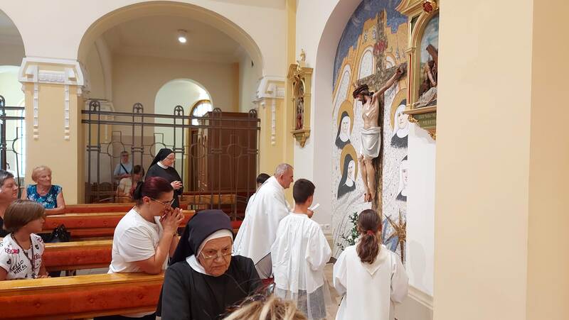 Došli su malo ranije, dok su Milosrdne sestre sv. Križa molile svoje Večernje hvale, a zatim su predmolili sv. krunicu. Mons. Škrinjarić poveo je i svoje ministrante, a su bili tu i redoviti ministranti u samostanskoj crkvi, što je dalo posebnu ljepotu euharistijskom slavlju. Hodočasnici su čitali Riječ Božju i Molitvu vjerniku, te vodili pjevanje uz pratnju na harmoniju. Oni su prinosili i Knjige s nakanama, prošnjama i zahvalama koje su vjernici i sestre upisivali kroz protekli mjesec. Na te nakane, i na one u srcima štovatelja bl. M. M. Terezije, bila je slavljena sv. Misa.