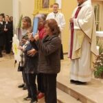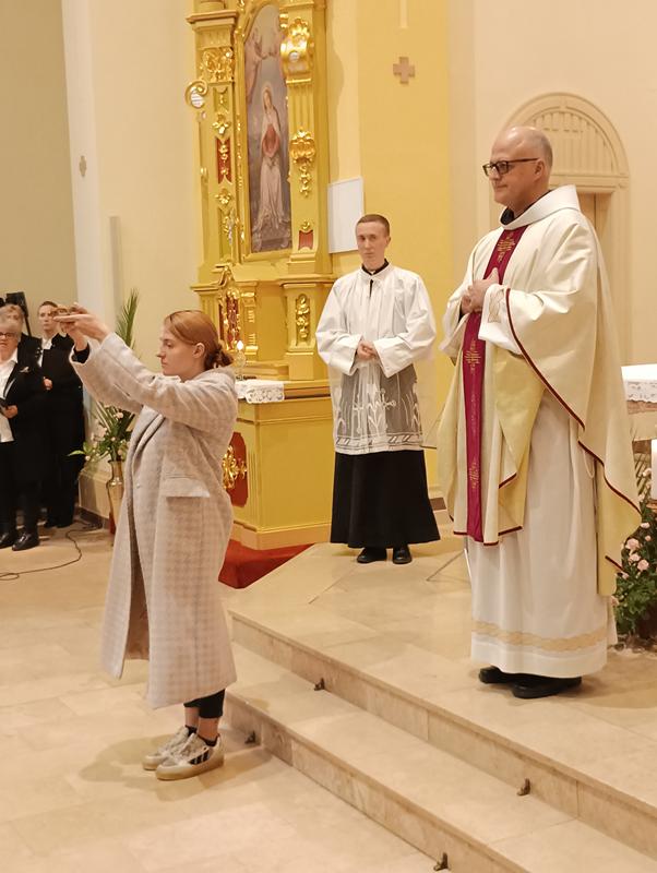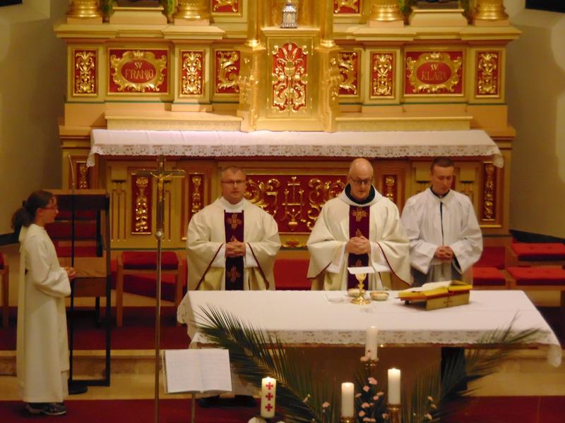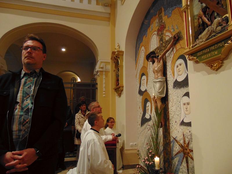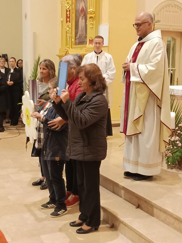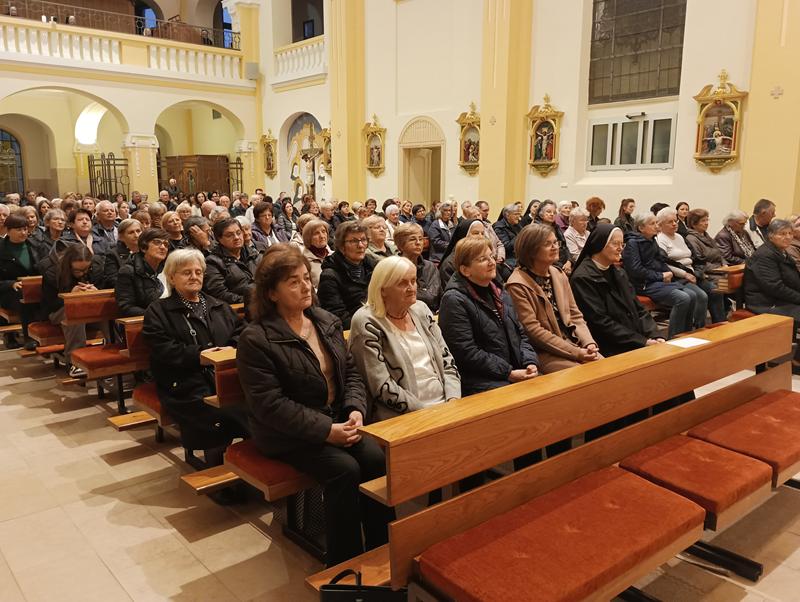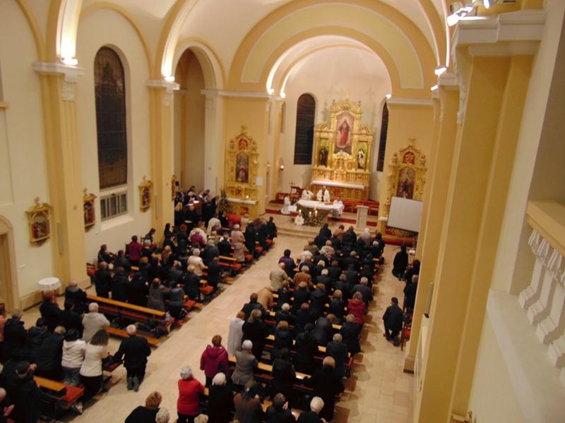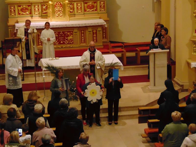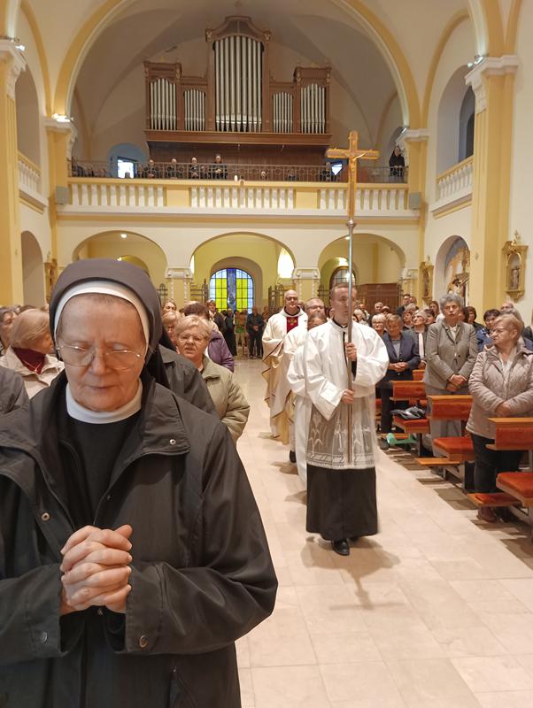 Kao i svaki puta bili su tu njezini redoviti štovatelji iz Đakova i okolice, a uz njih su ovamo došli i hodočasnici iz triju župa. Već dugo je bilo planirano hodočašće vjernika iz župe sv. Petra i Pavla iz Marijanaca, te Radikovaca, Čamagajevaca i Črnkovaca. U organizaciji njihovog župnika vlč. Marina Putilina, njih pedesetak je došlo autobusom u Đakovo. Najprije su išli u katedralu izmoliti oprost koji se u prvostolnici može dobiti u ovoj Jubilarnoj godini na planu opće Crkve. Poslije 17 sati došli su u samostansku crkvu. Gotovo u isto vrijeme stigli su autobusom i hodočasnici iz Slavonskog Broda, iz župe Bezgrješnog Srca Marijina predvođeni s. Ankicom Tomas. U njihovoj se župi svakog 16. u mjesecu sastaju štovatelji bl. M. M. Terezije i nadahnjuju se njezinom duhovnošću i njezinim svetim životom. Prije molitve krunice došli su autobusom i osobnim automobilima hodočasnici iz Vukovara, iz župe sv. Filipa i Jakova, u organizaciji njihovog župnika i gvardijana Franjevačkog samostana fra Tonia Vučemilovića. Fra Tonio je predvodio ovo svečano euharistijsko slavlje te nadahnuto i poticajno propovijedao povezavši s Evanđeljem dana blažen život bl. M. M. Terezije, a župni zbor Svete Cecilije predvodio je pjevanje uz vodstvo i pratnju na harmoniju orguljašice s. Mirele Štraub. Predstavnici župa su se uključili u predmoljavanje, čitanje na sv. misi, čitanje u Molitvi vjernika popraćenoj prikaznim darovima: svijeće sa groba bl. M. M. Terezije, iz Ingenbohla, kruha, vina i Knjiga prošnji i zahvala te simbola tratinčice, Terapijske zajednice sv. Josipa: „Tratinčice bl. M. M. Terezije“. Mnogi su se i ispovjedili.